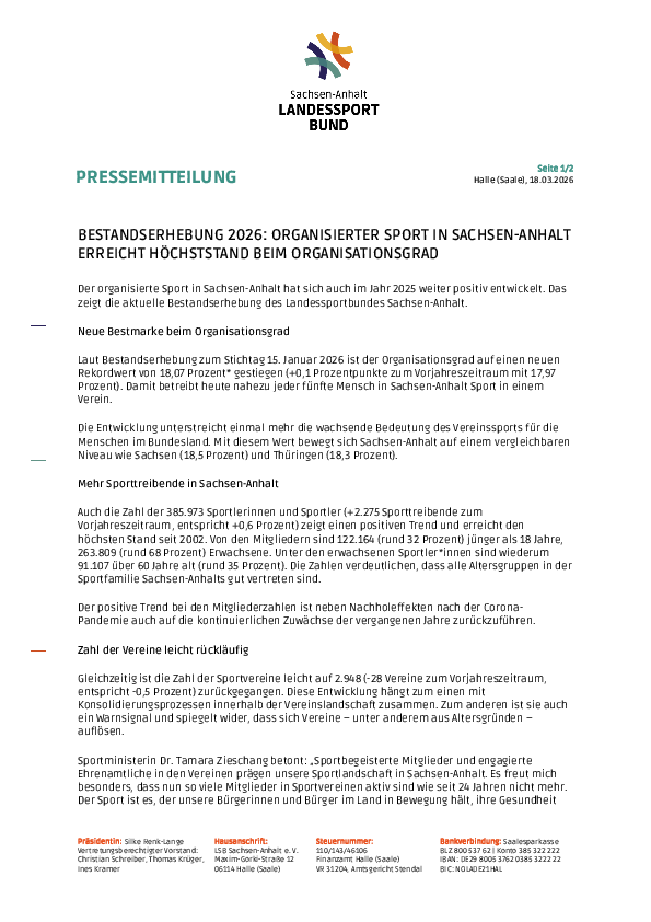 Christian Schreiber, Vorstandsvorsitzender des LSB, kommentiert die Ergebnisse der aktuellen Bestandserhebung: „Die aktuellen Zahlen zeigen erneut, wie attraktiv der organisierte Sport in Sachsen-Anhalt ist. Unsere Vereine schaffen Bewegungsangebote, Gemeinschaft und Engagement in allen Regionen des Landes.“